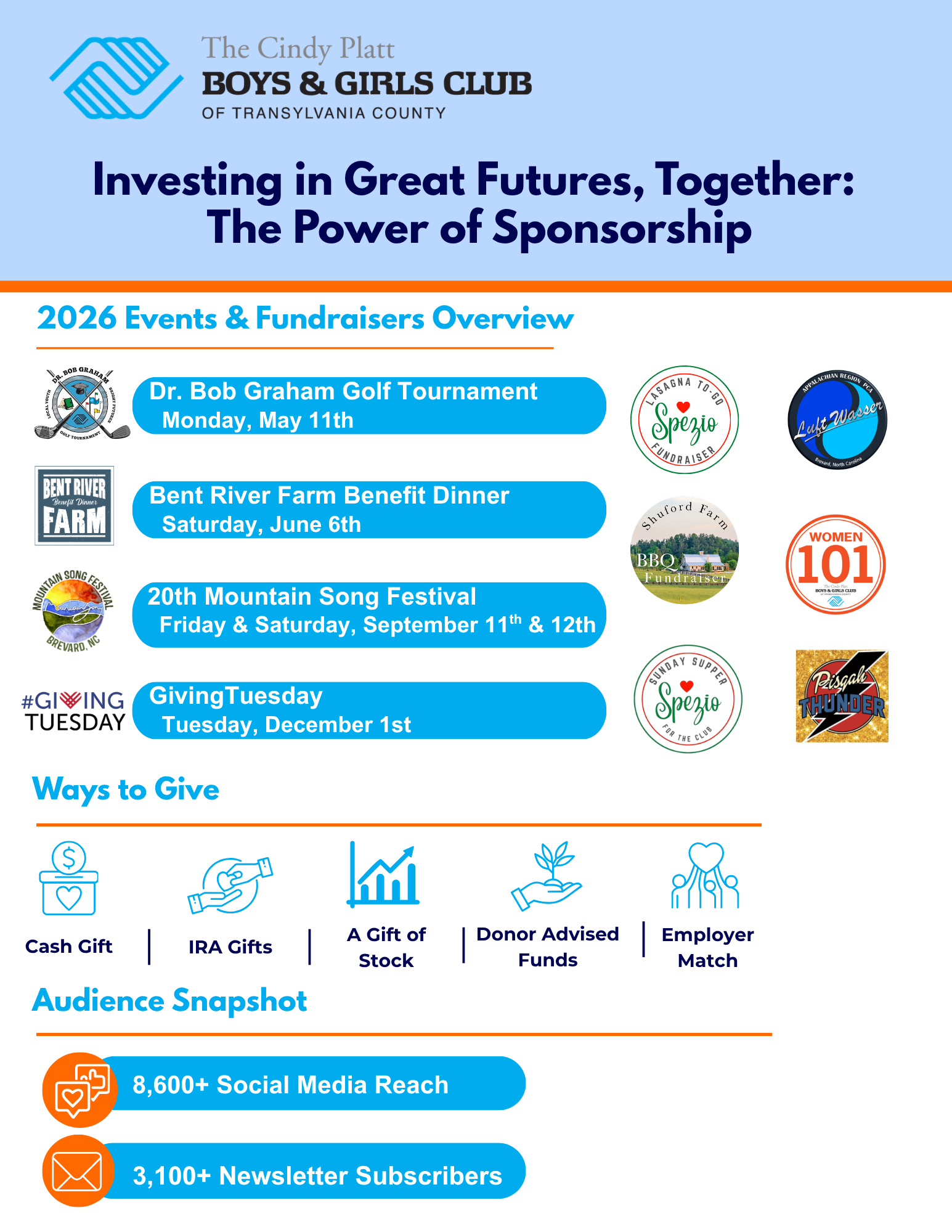 Please review our 2026 opportunities and events then contact Resource Development Director, Laresa Griffin at lgriffin@bgctransylvania.org or (828) 885-7800 ext. 106.