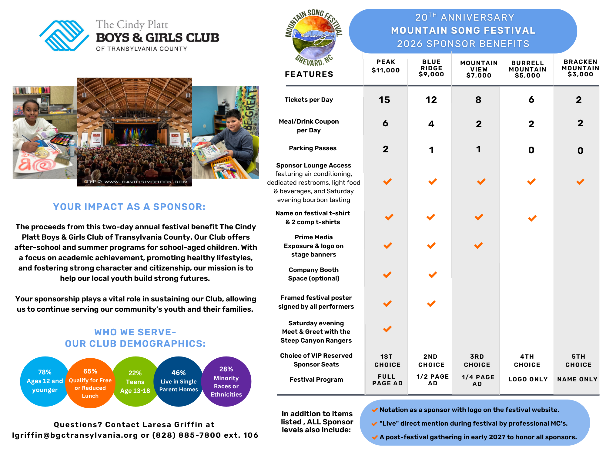 Mountain Song Festival was inspired by our youth and was developed to help fund the Cindy Platt Boys and Girls Club of Transylvania County.