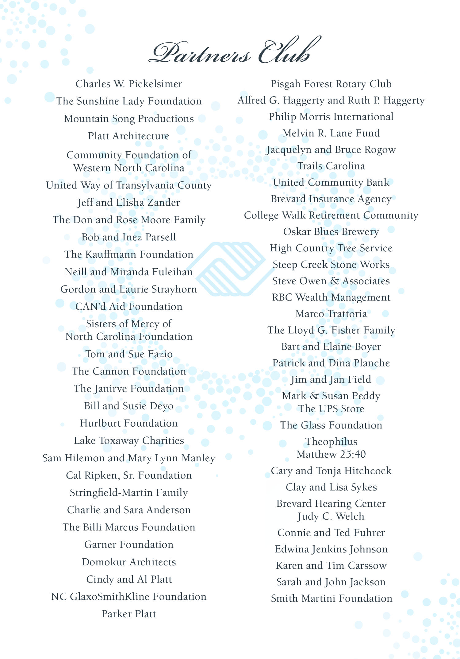 We are proud to recognize the following members of our Partners Club.