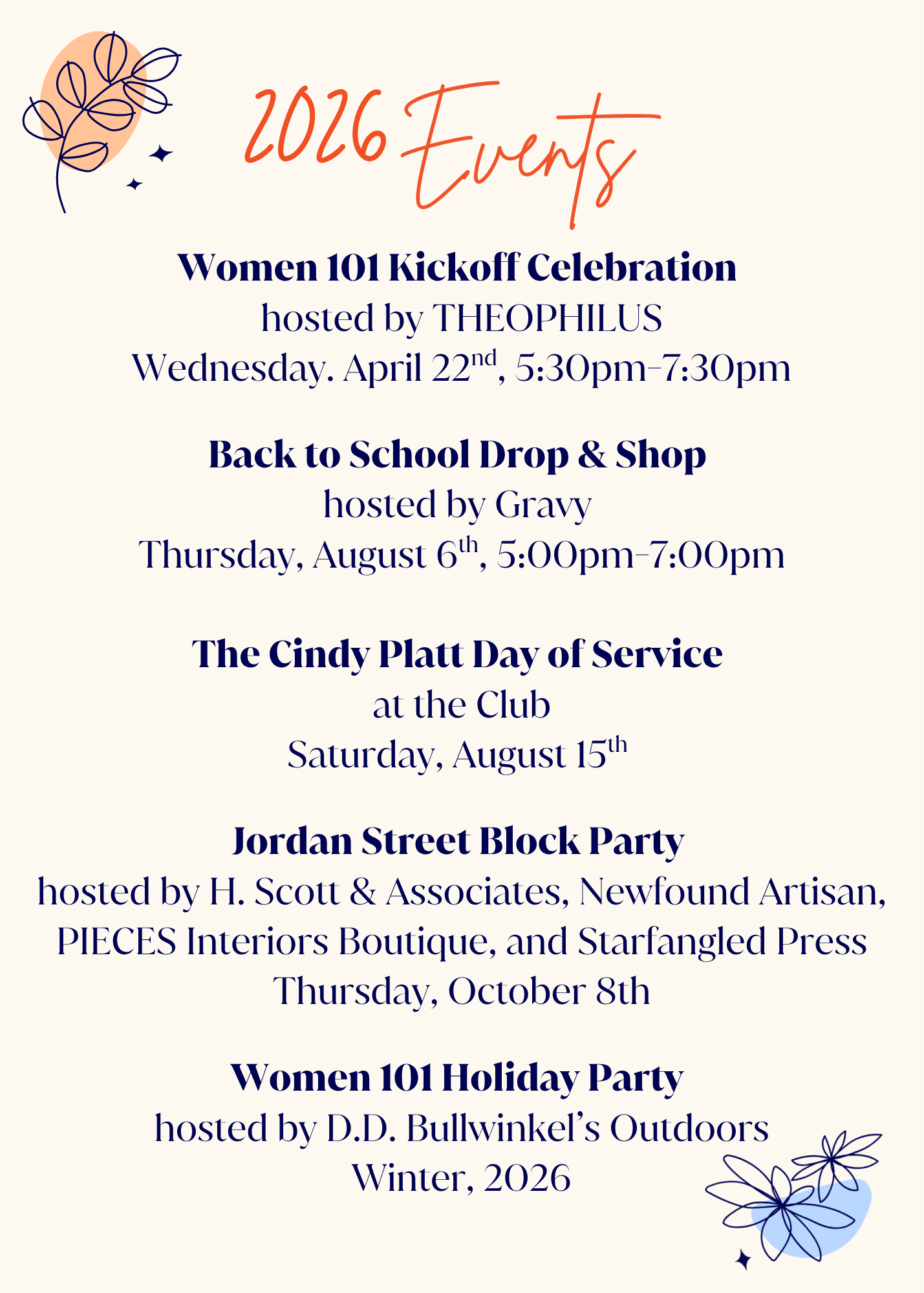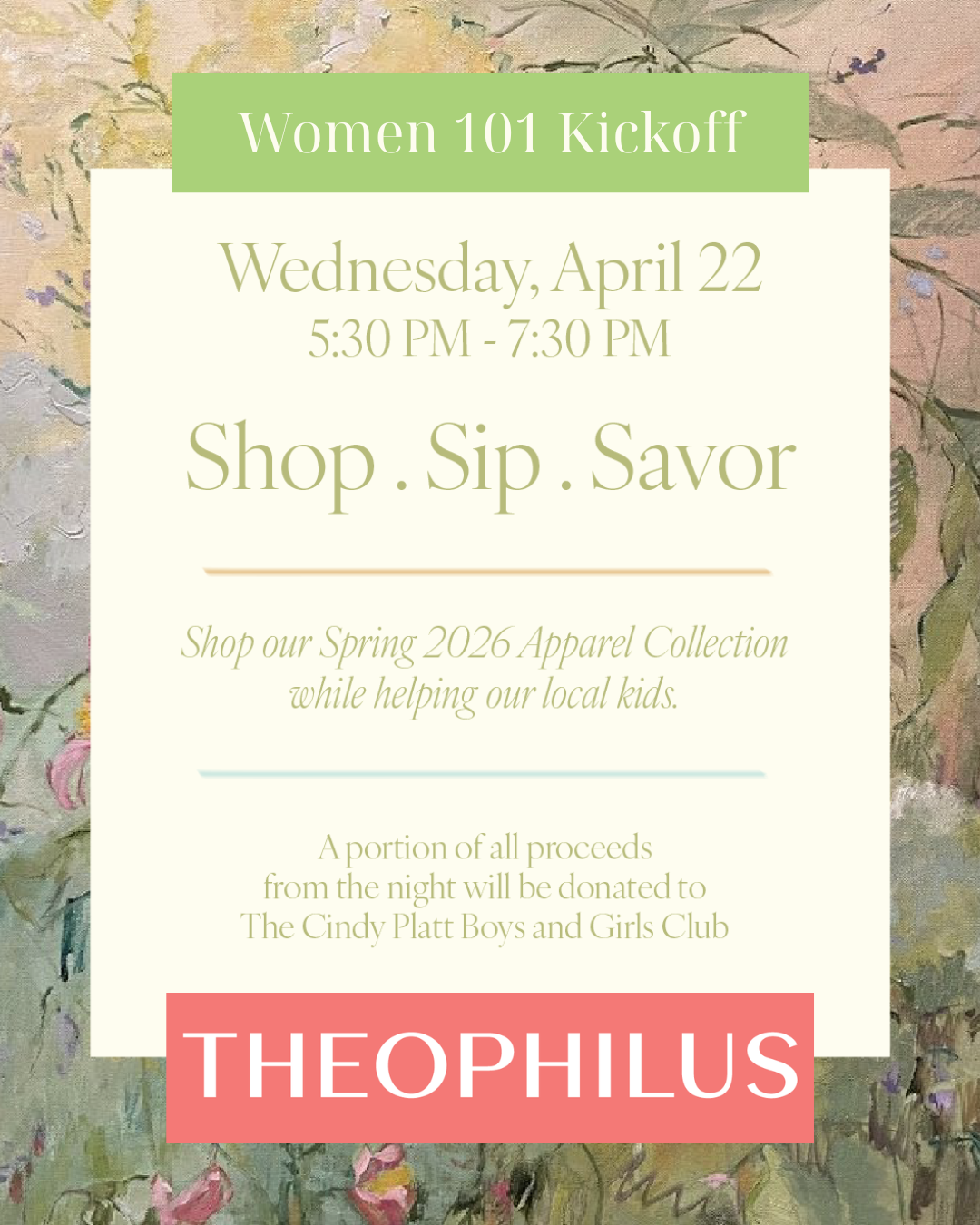 Join us as we gather to kick off our events for the year and celebrate the start of Women 101 in 2026! Enjoy light refreshments, connect with friends (new & old), and browse Theophilus' beautiful selection of spring shopping.