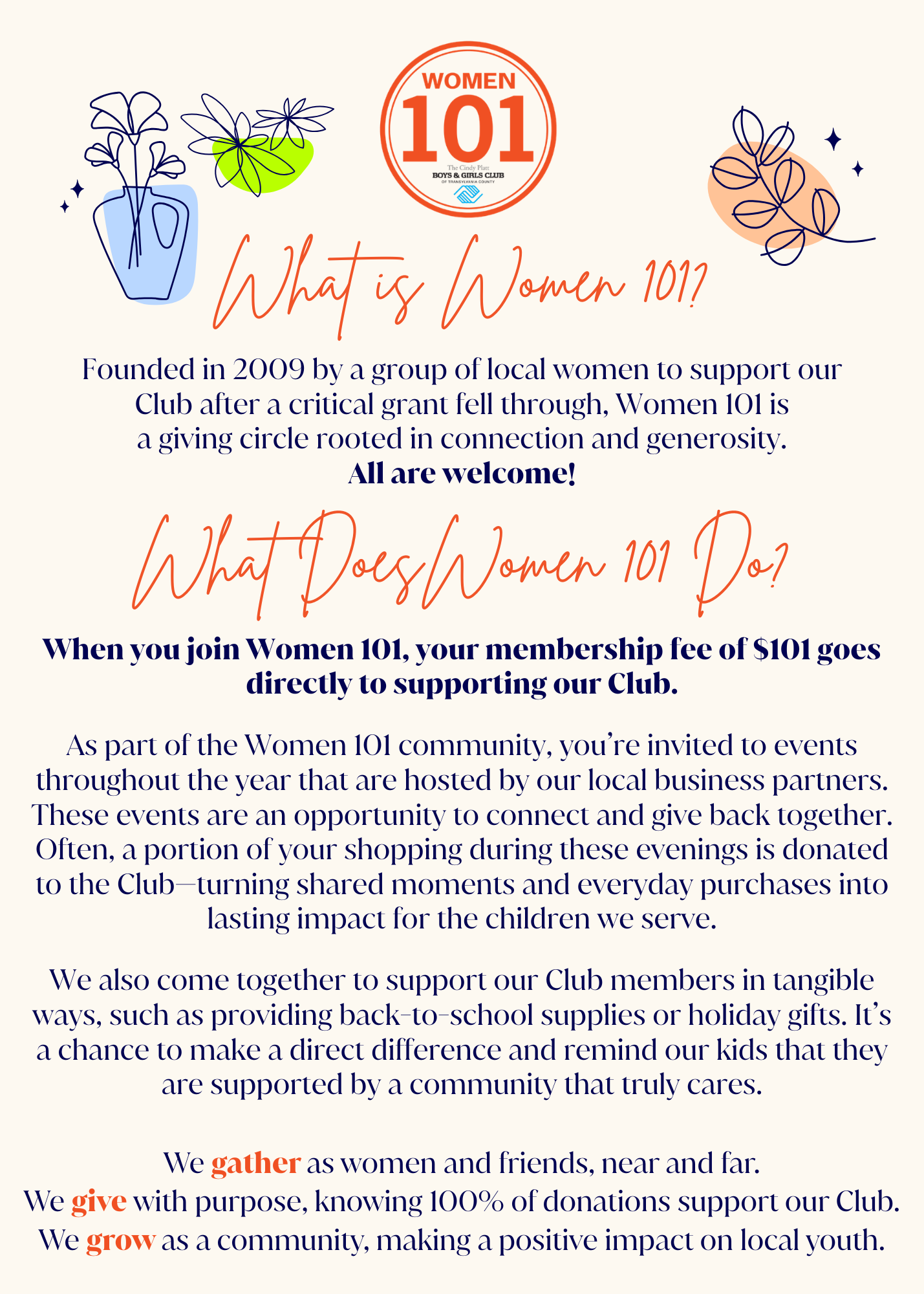WOMEN 101* was founded in 2009 to help The Cindy Platt Boys & Girls Club of Transylvania County. It is, quite simply, a group of women helping a group of children. One-hundred percent of your donation supports the Club.